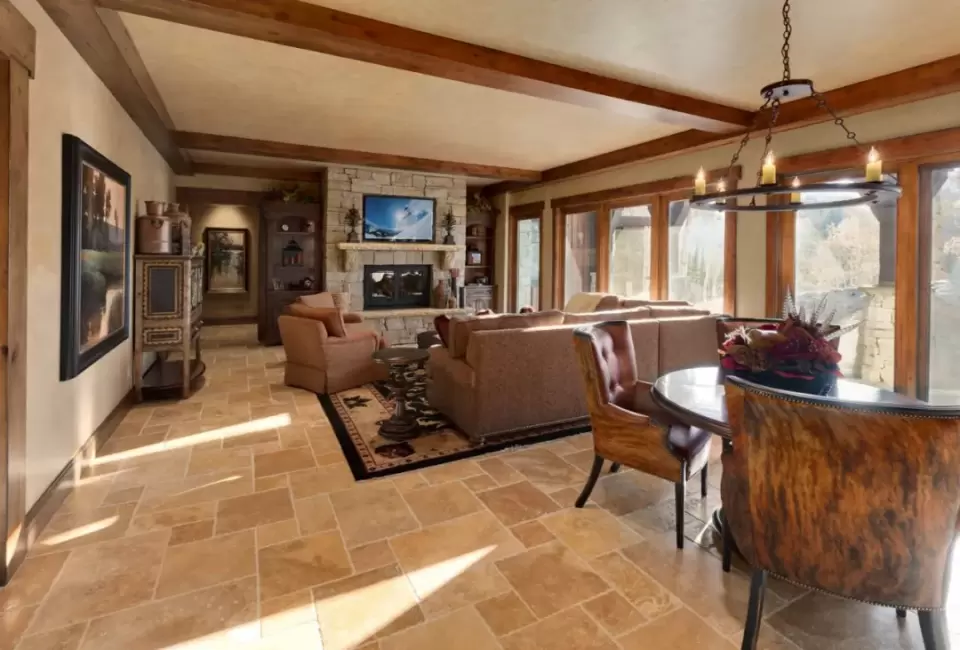 客厅永远是每一栋建筑的颜值担当,决定着每一位来访者的第一印象。现代化开放概念的客厅铺满了黄褐色的石灰石地板,8扇落地透明玻璃窗搭配米色的墙壁构建出了明亮的视觉空间,白色的石头壁炉充满了粗犷的原始风味,原木色的家居桌椅与窗外的丛林遥相呼应,一张波斯手工地毯构造出单独的空间,黄色的花卉图案设计搭配黑色边框,庄重肃穆的气息扑面而来。