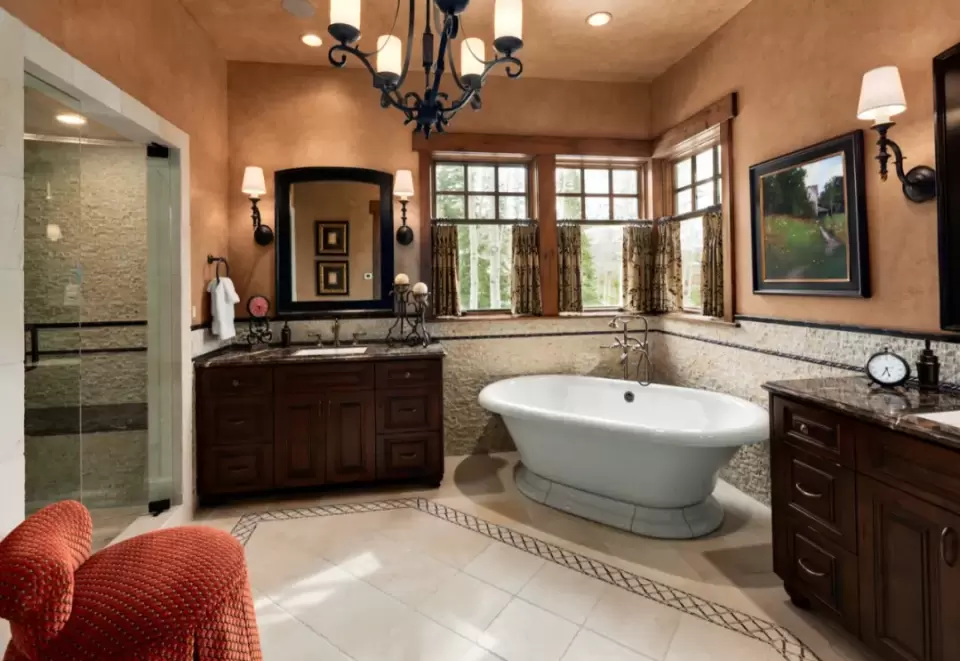 搭配主卧的是一间宽敞明亮的浴洗室,加入了大量的现代化设计元素,米色瓷砖随着空间构造出独特的艺术造型,白色凸起的墙面带具有浓烈的自然风格,深色黄岗岩台面木柜、橙色墙壁搭配现代化的闹钟摆件、纯白色的浴缸,极富工匠风格特色又方便了日常生活。