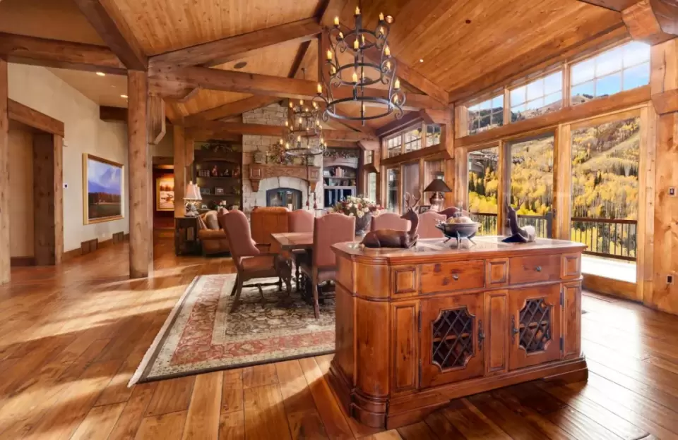 整个别墅里,最具有特色的当属这个原木餐厅。窗外的金黄色丛林美景尽收室内,古色古香的纯木地板、斜坡式木质屋顶和手工打造镂空物品展示柜,似乎让我们置身于丛林之中,感受最纯净的自然气息,三层铜制黑色吊灯、麋鹿摆件展现出端庄大气的工匠风格。