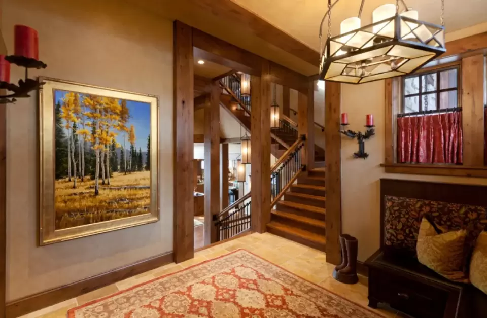 在入户玄关处,原木色的房梁搭配木制 U 形楼梯,充满了自然气息,黑铁金属吊灯和金属边框的自然风景壁画提升了空间的质感,尤其是来自东方的传统红黄色大花纹手工地毯富丽堂皇,彰显出主人的艺术眼光和高雅品味。