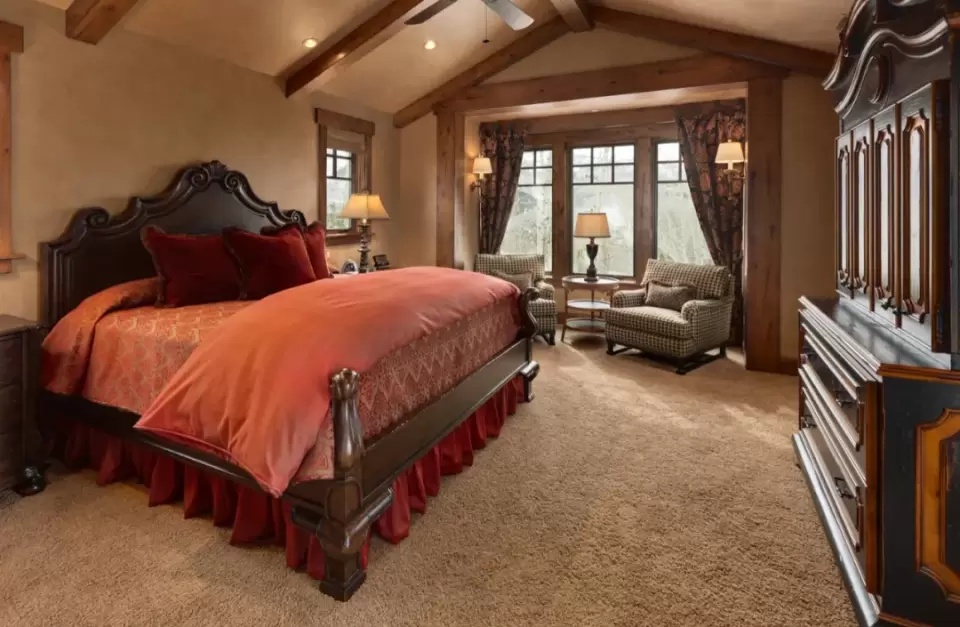 在主人卧室里,温暖的棕褐色成为主色调,褐色墙壁、棕色原木框架搭配一排手工衣柜,尽显低调奢华。