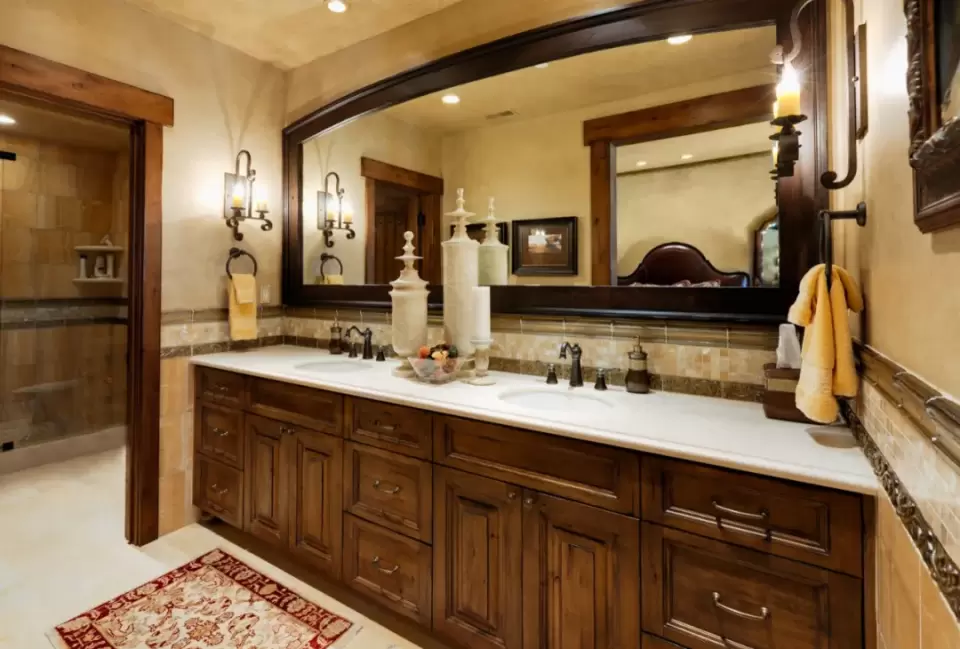 宽敞明亮的纯原木洗手台上,白色大理石台面设计搭配温暖的橘色蜡烛壁灯,无言中尽显奢华,中间的两个白色石头摆件造型别致,黑色边框的大镜子进一步扩大了空间感,营造出了宽敞的视觉体验。