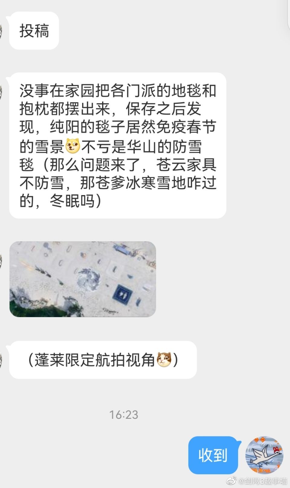 投稿,没事在家园把各门派的地毯和抱枕都摆出来,保存之后发现,纯阳的毯子居然免疫春节的雪景不亏是华山的防雪毯(那么问题来了,苍云家具不防雪,那苍爹冰寒雪地咋过的,冬眠吗)