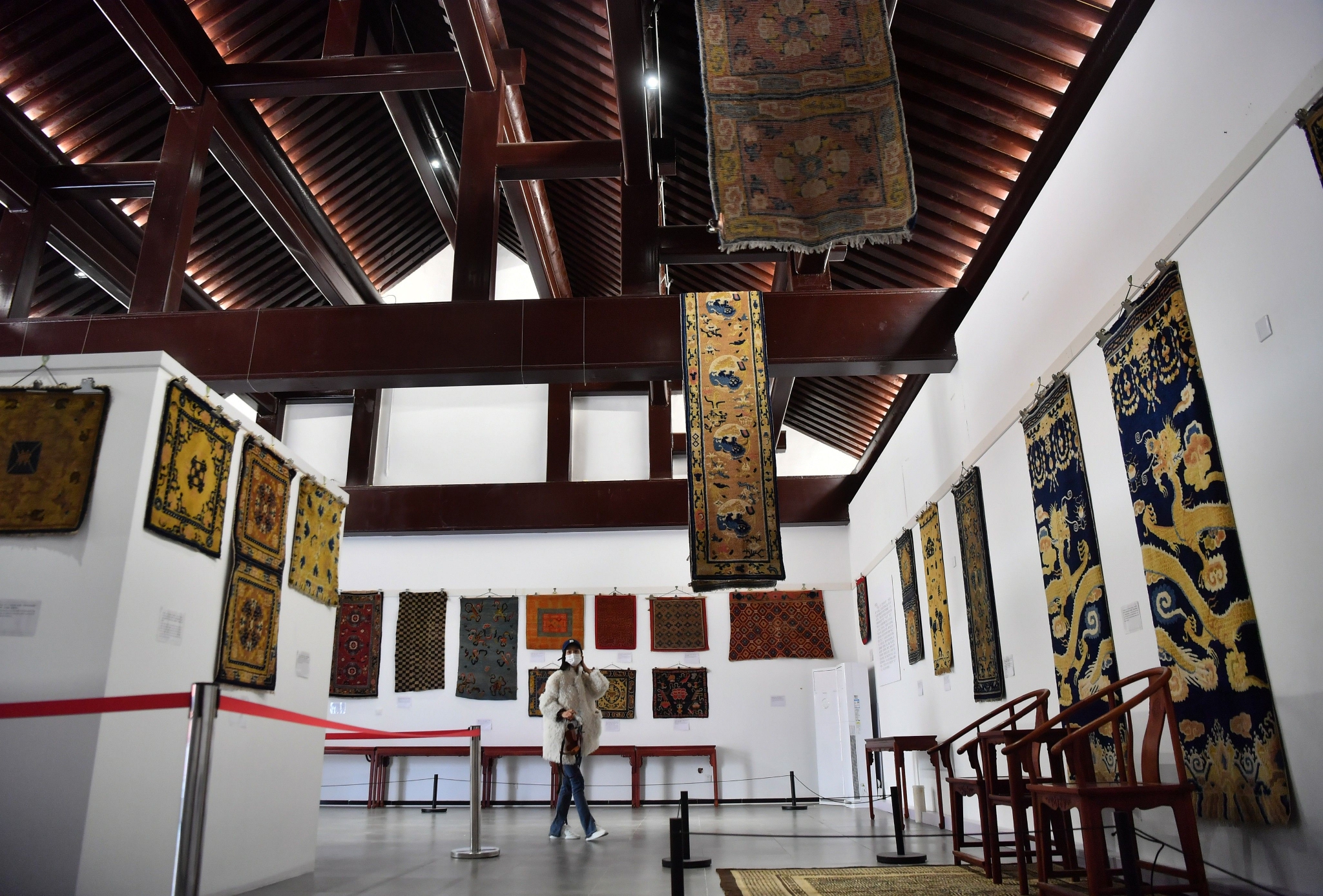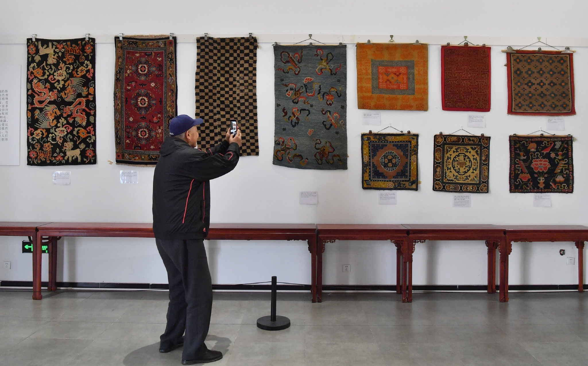 2023年3月8日,在北京龙顺成文化创意产业园,观众驻足欣赏具有百年以上历史存留至今不同地域特色的地毯作品。当日,由中国长城古毯协会主办的“中国古代地毯展”等一些列中国传统文化艺术展在这里开幕,全面立体呈现中国传统美学。